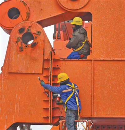 工人调试钢梁架设吊机走行部件。 中铁大桥局供图
