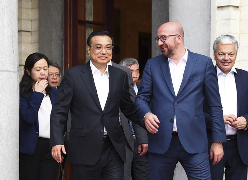 中新社 刘震 摄 (一) 按照外交安排,这本该是一场“工作午宴”,但李克强总理这里只有“午餐工作”。 当地时间6月2日,第十九次中国-欧盟领导人会晤在布鲁塞尔举行,从上午一直谈到中午。后面还有全球媒体翘首等待的共见记者会,所以李克强和图斯克、容克以及陪同人员的午餐只是两个菜一道甜品。 “请您先用餐,我们再接着谈。”图斯克说。 “没关系,咱们边吃边谈。”李克强说。 于是,三位领导人一边进餐一边继续商谈。 这只是李克强此次欧洲“旋风访问”的一个缩影。在柏林停留不到25小时,大大小小12场活动;在布鲁塞尔,24小时居然足足安排了中欧、中比间19场会谈和活动。 从会议室到论坛,再到工商峰会现场,包括大部分的午餐和晚餐时间,都被李克强用来与对方领导人沟通和谈判。 抵达柏林当晚,默克尔举行私人宴会款待李克强。可千万别以为这只是“轻松”的差事,两位总理把此前年度会晤中一些意犹未尽的话题接着带到了晚宴上,原定一小时,结果进行了两个多小时。也正是在这场私人晚宴上,李克强最终说服默克尔在次日上午共见记者时公开表态,德国支持欧盟履行中国入世议定书第15条义务。