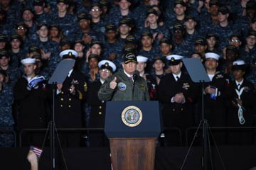 3月2日,在美国弗吉尼亚州纽波特纽斯,美国总统特朗普在“杰拉尔德·福特”号航母上讲话。记者 殷博古/摄