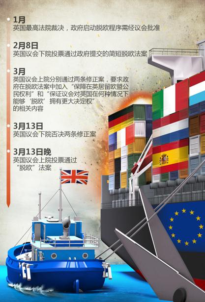 据美联社报道,英国当地时间3月13日,英议会上下两院分别投票通过了政府提交的脱欧法案,为英国启动脱欧进程扫清最后障碍,意味着英首相特蕾莎·梅有权启动《里斯本条约》第50条。梅姨14日在议会表示,英政府将按计划在3月底前启动。