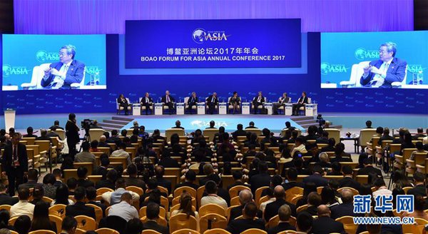 3月25日,博鳌亚洲论坛2017年年会在海南省博鳌举行全体大会,讨论直面全球化与自由贸易的未来。 新华社记者 赵颖全 摄
