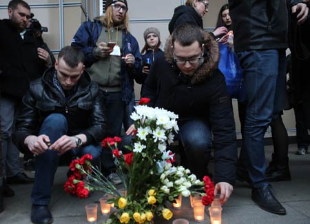 图为当日,在俄罗斯圣彼得堡,民众悼念地铁爆炸事件遇难者。新华社发(莫京娜 摄)