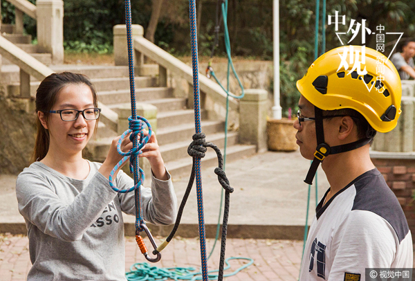 2014年10月23日,福建省厦门大学的“爬树课”课堂上,老师在给同学们讲解绳子的捆绑方法,同学们认真听讲后上前做练习。王威/视觉中国