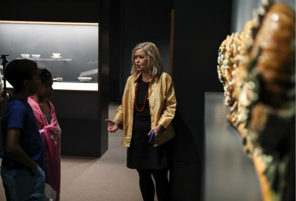 劳里·巴恩斯正在展馆内向小学生介绍中国文物。(新华社记者王迎摄)