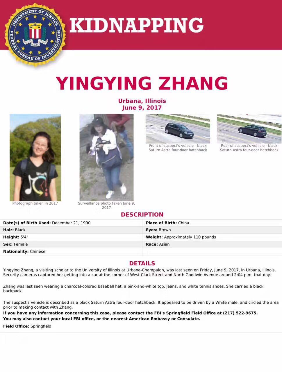 当地时间6月14日,美国联邦调查局已经将伊利诺伊大学香槟分校中国访问学者章莹颖的失踪案定性为绑架。据了解,自6月9号下午章莹颖被一辆黑色的车带走后,至今下落不明。事件发生后在当地引发高度关注。当地华人华侨留学生连续几天进行了搜寻。中国驻芝加哥总领事馆已经联系到章莹颖家人,并协助办理赴美签证。当地警方在当地时间14日下午接受本台记者采访时表示,他们联合美国联邦调查局等执法机构对该案件进行全面调查。(央视记者 李卉)